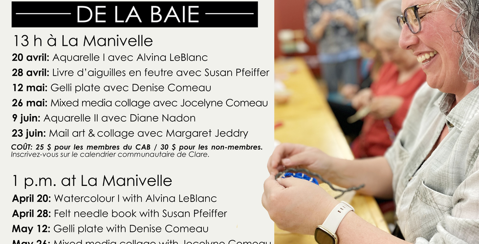 Ce printemps, le Conseil des arts de la Baie fait équipe avec Loisirs de Clare pour offrir une série d’ateliers pour débutant.es âgé.es de 16 ans et plus.