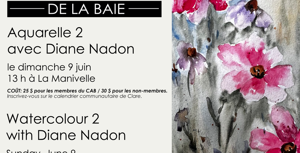 Joignez-vous à nous à La Manivelle, au sous-sol du Centre de bienvenue Rendez-vous de la Baie (campus de l'Université Sainte-Anne). Le coût est de 15 $ pour les membres du Conseil des Arts de la Baie, et de 20 $ pour les non-membres. Tout le matériel est fourni!